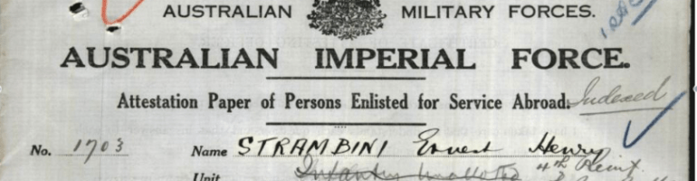 Bill Strambini went on with the 9th to France, and his Casualty Form shows him as “wounded in the right arm by shrapnel“ at Pozieres on 25 July 1916. He returned home to North Queensland. He did not change his surname, did not marry, and worked for most of his life as an administrator for a large stevedoring company on the Cairns docks.